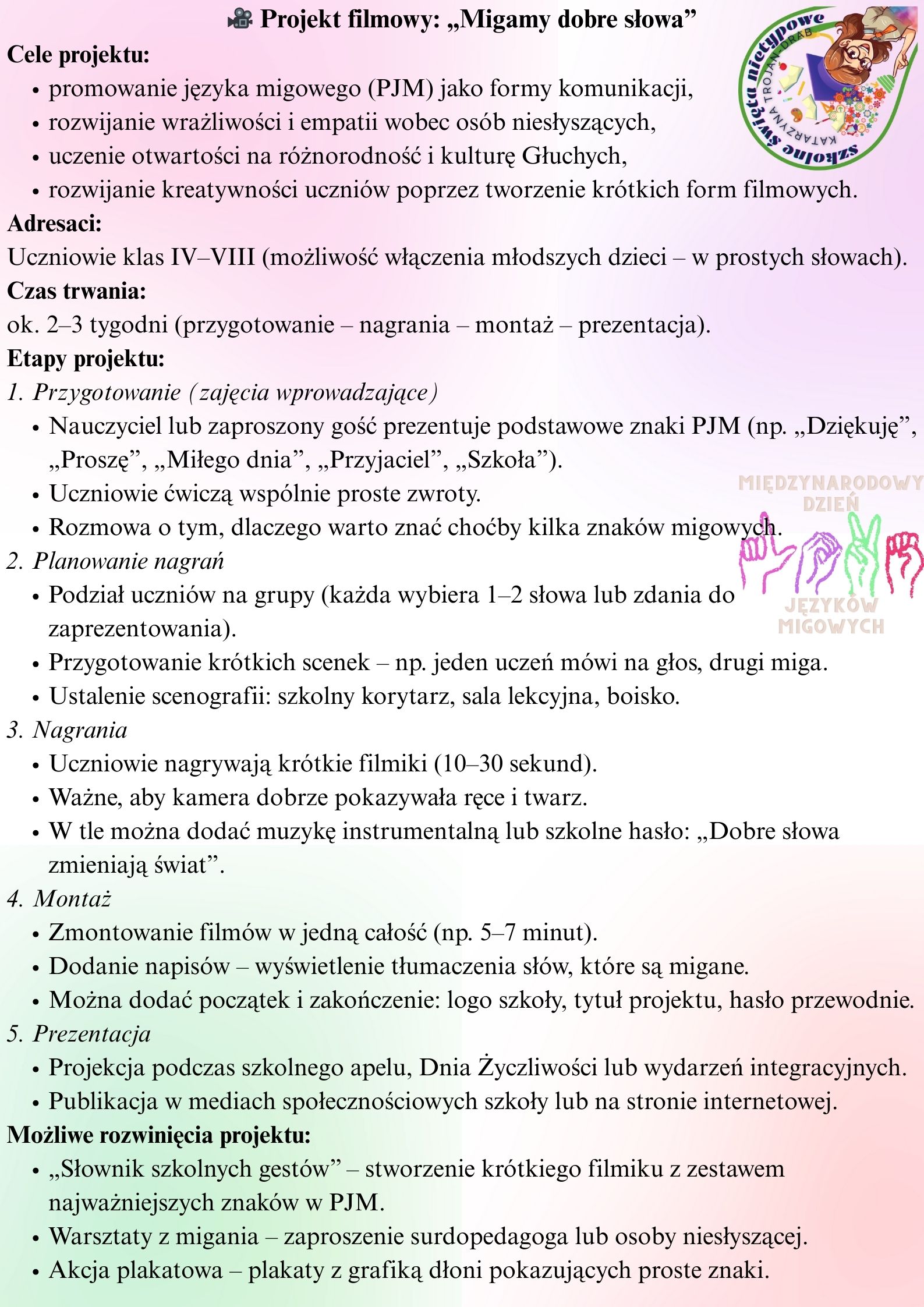Uczniowie mogą nagrać krótkie filmiki, w których przedstawiają wyrazy lub całe zdania w PJM, np. „Dziękuję”, „Miłego dnia”, „Szkoła”. Projekcja filmu może być elementem szkolnego apelu lub udostępniona w mediach społecznościowych szkoły.