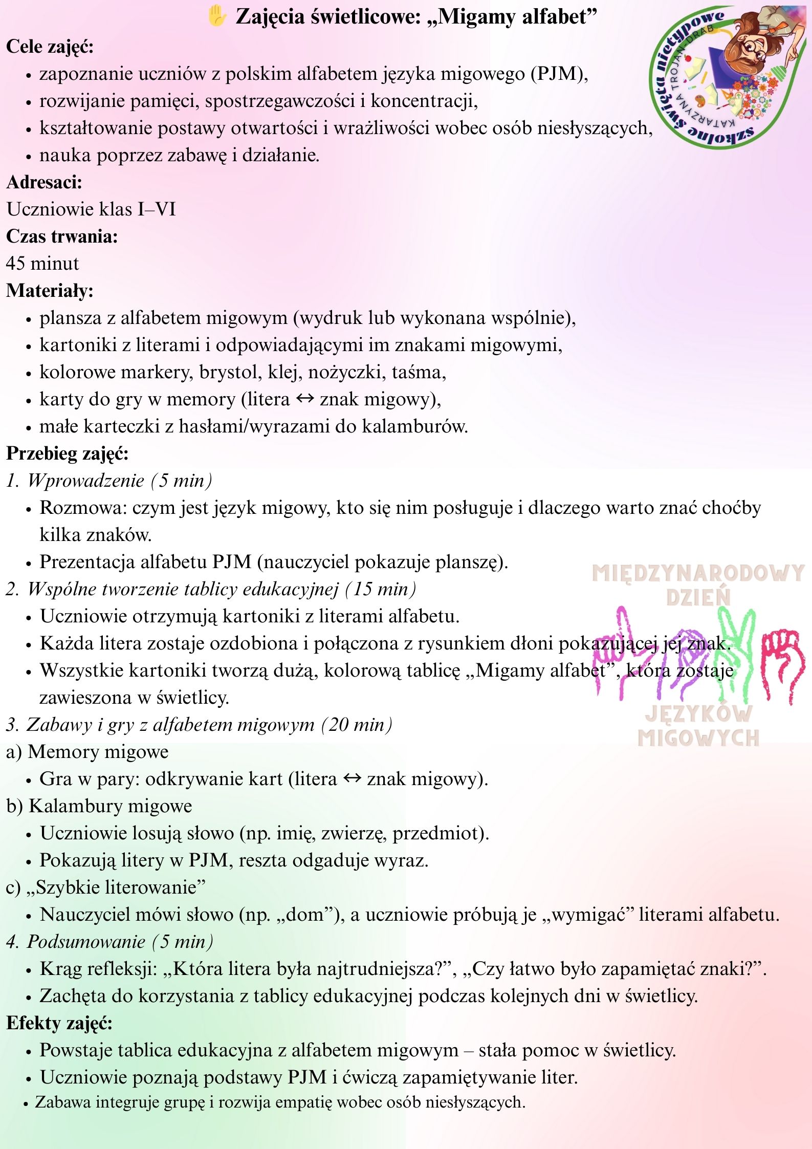 🧩 7. Zajęcia świetlicowe: „Migamy alfabet”