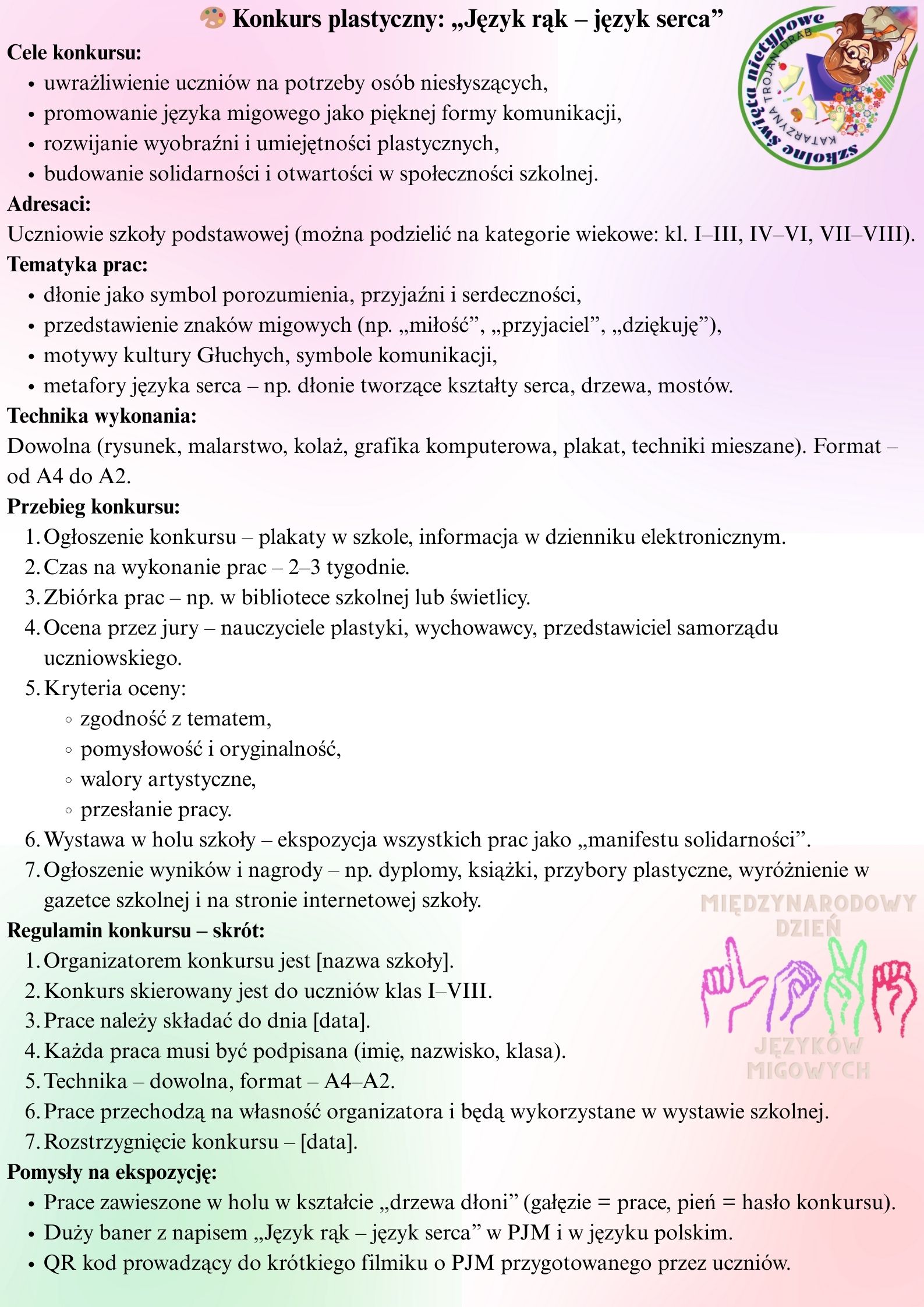 Prace mogą przedstawiać dłonie, migające słowa, symbole kultury Głuchych. Wystawa w holu szkoły może stać się wizualnym manifestem solidarności.